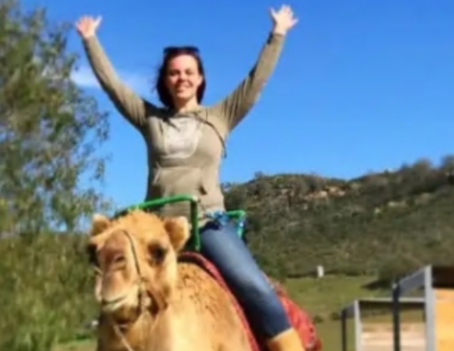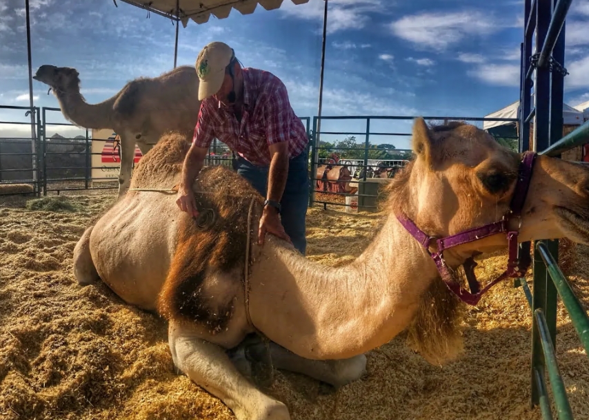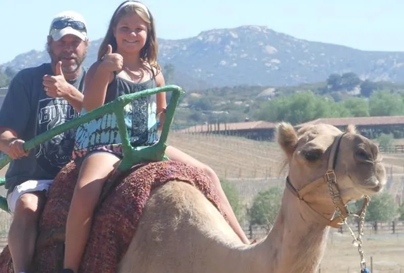 我们的骆驼骑行体验就是我们所说的“县集市式”骑行。骑手从平台上骑上骆驼(你走上大约五级楼梯),然后轻轻地坐在骆驼背上。你周围有一道栏杆,还有可以抓住的灯条。骆驼由驯马师带领,在胡椒树和我们的牛骆驼(Zohan的单身汉营地)之间的一大片椭圆形区域内漫步。每次骑行约3分钟。